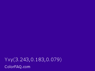 Yxy 3.243,0.183,0.079 Color is a dark violet color and the nearest color is Blue Gem #2c0e8c. Hex code #3a0299 and RGB value is rgb(58,2,153). In RGB color space, this color is composed of 23% red, 1% green, 60% blue, In CMYK color space, this color is composed of 62% cyan, 99% magenta, 0% yellow , 40% black , In HSL color space, this color has a hue angle of 262° , 97% saturation and 30% lightness.