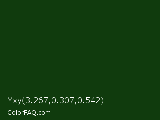 Yxy 3.267,0.307,0.542 Color is a very dark green color and the nearest color is Palm Leaf #19330e. Hex code #103b0d and RGB value is rgb(16,59,13). In RGB color space, this color is composed of 6% red, 23% green, 5% blue, In CMYK color space, this color is composed of 73% cyan, 0% magenta, 78% yellow , 77% black , In HSL color space, this color has a hue angle of 116° , 64% saturation and 14% lightness.
