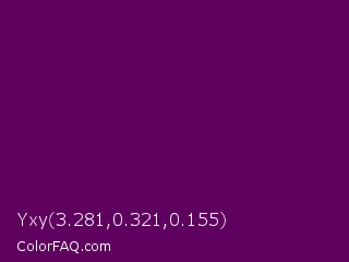 Yxy 3.281,0.321,0.155 Color is a very dark magenta color and the nearest color is Clairvoyant #480656. Hex code #5f015f and RGB value is rgb(95,1,95). In RGB color space, this color is composed of 37% red, 0% green, 37% blue, In CMYK color space, this color is composed of 0% cyan, 99% magenta, 0% yellow , 63% black , In HSL color space, this color has a hue angle of 300° , 98% saturation and 19% lightness.