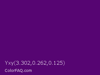Yxy 3.302,0.262,0.125 Color is a dark purple color and the nearest color is Pigment Indigo #4b0082. Hex code #560572 and RGB value is rgb(86,5,114). In RGB color space, this color is composed of 34% red, 2% green, 45% blue, In CMYK color space, this color is composed of 25% cyan, 96% magenta, 0% yellow , 55% black , In HSL color space, this color has a hue angle of 285° , 92% saturation and 23% lightness.