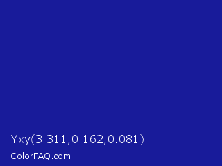 Yxy 3.311,0.162,0.081 Color is a normal blue color and the nearest color is Jacksons Purple #20208d. Hex code #181b9a and RGB value is rgb(24,27,154). In RGB color space, this color is composed of 9% red, 11% green, 60% blue, In CMYK color space, this color is composed of 84% cyan, 82% magenta, 0% yellow , 40% black , In HSL color space, this color has a hue angle of 239° , 73% saturation and 35% lightness.