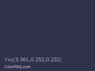 Yxy 3.361,0.252,0.232 Color is a dark blue color and the nearest color is Martinique #363050. Hex code #30314d and RGB value is rgb(48,49,77). In RGB color space, this color is composed of 19% red, 19% green, 30% blue, In CMYK color space, this color is composed of 38% cyan, 36% magenta, 0% yellow , 70% black , In HSL color space, this color has a hue angle of 238° , 23% saturation and 25% lightness.