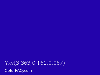 Yxy 3.363,0.161,0.067 Color is a normal indigo color and the nearest color is Ultramarine #120a8f. Hex code #2303ab and RGB value is rgb(35,3,171). In RGB color space, this color is composed of 14% red, 1% green, 67% blue, In CMYK color space, this color is composed of 80% cyan, 98% magenta, 0% yellow , 33% black , In HSL color space, this color has a hue angle of 251° , 97% saturation and 34% lightness.