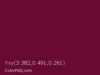Yxy 3.382,0.491,0.261 Color is a very dark rose color and the nearest color is Black Rose #67032d. Hex code #680a31 and RGB value is rgb(104,10,49). In RGB color space, this color is composed of 41% red, 4% green, 19% blue, In CMYK color space, this color is composed of 0% cyan, 90% magenta, 53% yellow , 59% black , In HSL color space, this color has a hue angle of 335° , 82% saturation and 22% lightness.