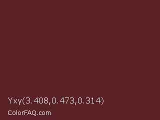 Yxy 3.408,0.473,0.314 Color is a dark red color and the nearest color is Caput Mortuum #592720. Hex code #5a2127 and RGB value is rgb(90,33,39). In RGB color space, this color is composed of 35% red, 13% green, 15% blue, In CMYK color space, this color is composed of 0% cyan, 63% magenta, 57% yellow , 65% black , In HSL color space, this color has a hue angle of 354° , 46% saturation and 24% lightness.