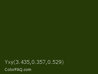 Yxy 3.435,0.357,0.529 Color is a very dark green color and the nearest color is Turtle Green #2a380b. Hex code #253a07 and RGB value is rgb(37,58,7). In RGB color space, this color is composed of 15% red, 23% green, 3% blue, In CMYK color space, this color is composed of 36% cyan, 0% magenta, 88% yellow , 77% black , In HSL color space, this color has a hue angle of 85° , 78% saturation and 13% lightness.