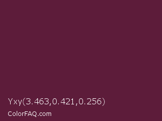 Yxy 3.463,0.421,0.256 Color is a dark rose color and the nearest color is Wine Berry #591d35. Hex code #5d1c3a and RGB value is rgb(93,28,58). In RGB color space, this color is composed of 36% red, 11% green, 23% blue, In CMYK color space, this color is composed of 0% cyan, 70% magenta, 38% yellow , 64% black , In HSL color space, this color has a hue angle of 332° , 54% saturation and 24% lightness.