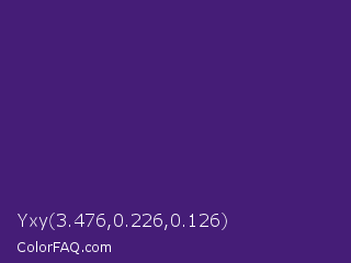 Yxy 3.476,0.226,0.126 Color is a dark violet color and the nearest color is Meteorite #3c1f76. Hex code #451d77 and RGB value is rgb(69,29,119). In RGB color space, this color is composed of 27% red, 11% green, 47% blue, In CMYK color space, this color is composed of 42% cyan, 76% magenta, 0% yellow , 53% black , In HSL color space, this color has a hue angle of 267° , 61% saturation and 29% lightness.
