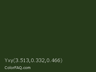 Yxy 3.513,0.332,0.466 Color is a very dark green color and the nearest color is Mallard #233418. Hex code #263a1a and RGB value is rgb(38,58,26). In RGB color space, this color is composed of 15% red, 23% green, 10% blue, In CMYK color space, this color is composed of 34% cyan, 0% magenta, 55% yellow , 77% black , In HSL color space, this color has a hue angle of 98° , 38% saturation and 16% lightness.