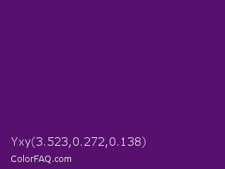 Yxy 3.523,0.272,0.138 Color is a dark purple color and the nearest color is Honey Flower #4f1c70. Hex code #57106e and RGB value is rgb(87,16,110). In RGB color space, this color is composed of 34% red, 6% green, 43% blue, In CMYK color space, this color is composed of 21% cyan, 85% magenta, 0% yellow , 57% black , In HSL color space, this color has a hue angle of 285° , 75% saturation and 25% lightness.