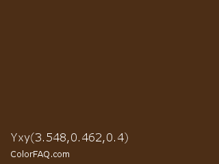 Yxy 3.548,0.462,0.4 Color is a very dark orange color and the nearest color is Brown Derby #492615. Hex code #4c2e16 and RGB value is rgb(76,46,22). In RGB color space, this color is composed of 30% red, 18% green, 9% blue, In CMYK color space, this color is composed of 0% cyan, 39% magenta, 71% yellow , 70% black , In HSL color space, this color has a hue angle of 27° , 55% saturation and 19% lightness.