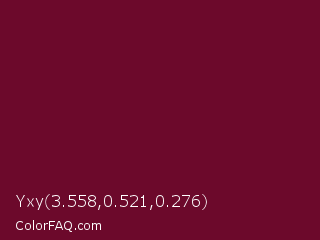 Yxy 3.558,0.521,0.276 Color is a dark rose color and the nearest color is Black Rose #67032d. Hex code #6c092b and RGB value is rgb(108,9,43). In RGB color space, this color is composed of 42% red, 4% green, 17% blue, In CMYK color space, this color is composed of 0% cyan, 92% magenta, 60% yellow , 58% black , In HSL color space, this color has a hue angle of 339° , 85% saturation and 23% lightness.