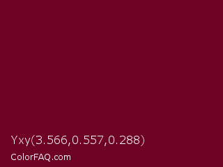 Yxy 3.566,0.557,0.288 Color is a very dark rose color and the nearest color is Black Rose #67032d. Hex code #6f0323 and RGB value is rgb(111,3,35). In RGB color space, this color is composed of 44% red, 1% green, 14% blue, In CMYK color space, this color is composed of 0% cyan, 97% magenta, 68% yellow , 56% black , In HSL color space, this color has a hue angle of 342° , 95% saturation and 22% lightness.