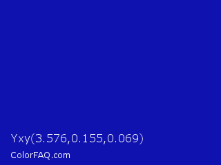 Yxy 3.576,0.155,0.069 Color is a normal blue color and the nearest color is Zaffre #0014a8. Hex code #0f12ae and RGB value is rgb(15,18,174). In RGB color space, this color is composed of 6% red, 7% green, 68% blue, In CMYK color space, this color is composed of 91% cyan, 90% magenta, 0% yellow , 32% black , In HSL color space, this color has a hue angle of 239° , 84% saturation and 37% lightness.