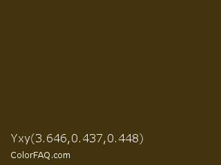 Yxy 3.646,0.437,0.448 Color is a very dark orange color and the nearest color is Camouflage #3c3910. Hex code #42340e and RGB value is rgb(66,52,14). In RGB color space, this color is composed of 26% red, 20% green, 5% blue, In CMYK color space, this color is composed of 0% cyan, 21% magenta, 79% yellow , 74% black , In HSL color space, this color has a hue angle of 44° , 65% saturation and 16% lightness.