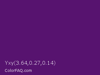 Yxy 3.64,0.27,0.14 Color is a dark purple color and the nearest color is Honey Flower #4f1c70. Hex code #57136f and RGB value is rgb(87,19,111). In RGB color space, this color is composed of 34% red, 7% green, 44% blue, In CMYK color space, this color is composed of 22% cyan, 83% magenta, 0% yellow , 56% black , In HSL color space, this color has a hue angle of 284° , 71% saturation and 25% lightness.