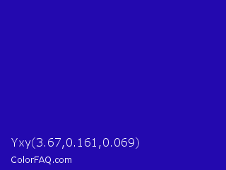 Yxy 3.67,0.161,0.069 Color is a normal indigo color and the nearest color is Interdimensional Blue #360ccc. Hex code #2309af and RGB value is rgb(35,9,175). In RGB color space, this color is composed of 14% red, 4% green, 69% blue, In CMYK color space, this color is composed of 80% cyan, 95% magenta, 0% yellow , 31% black , In HSL color space, this color has a hue angle of 249° , 90% saturation and 36% lightness.