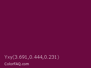 Yxy 3.691,0.444,0.231 Color is a dark magenta color and the nearest color is Tyrian Purple #66023c. Hex code #6b0940 and RGB value is rgb(107,9,64). In RGB color space, this color is composed of 42% red, 4% green, 25% blue, In CMYK color space, this color is composed of 0% cyan, 92% magenta, 40% yellow , 58% black , In HSL color space, this color has a hue angle of 326° , 84% saturation and 23% lightness.