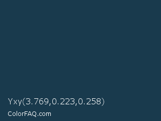 Yxy 3.769,0.223,0.258 Color is a very dark blue color and the nearest color is Nile Blue #193751. Hex code #193a4d and RGB value is rgb(25,58,77). In RGB color space, this color is composed of 10% red, 23% green, 30% blue, In CMYK color space, this color is composed of 68% cyan, 25% magenta, 0% yellow , 70% black , In HSL color space, this color has a hue angle of 202° , 51% saturation and 20% lightness.