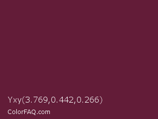 Yxy 3.769,0.442,0.266 Color is a dark rose color and the nearest color is Wine Berry #591d35. Hex code #631c38 and RGB value is rgb(99,28,56). In RGB color space, this color is composed of 39% red, 11% green, 22% blue, In CMYK color space, this color is composed of 0% cyan, 72% magenta, 43% yellow , 61% black , In HSL color space, this color has a hue angle of 336° , 56% saturation and 25% lightness.