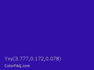 Yxy 3.777,0.172,0.078 Color is a normal indigo color and the nearest color is Blue Gem #2c0e8c. Hex code #3110a6 and RGB value is rgb(49,16,166). In RGB color space, this color is composed of 19% red, 6% green, 65% blue, In CMYK color space, this color is composed of 70% cyan, 90% magenta, 0% yellow , 35% black , In HSL color space, this color has a hue angle of 253° , 82% saturation and 36% lightness.