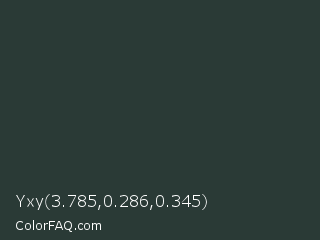 Yxy 3.785,0.286,0.345 Color is a very dark cyan color and the nearest color is Outer Space Crayola #2d383a. Hex code #2a3a36 and RGB value is rgb(42,58,54). In RGB color space, this color is composed of 16% red, 23% green, 21% blue, In CMYK color space, this color is composed of 28% cyan, 0% magenta, 7% yellow , 77% black , In HSL color space, this color has a hue angle of 165° , 16% saturation and 20% lightness.