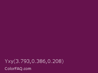Yxy 3.793,0.386,0.208 Color is a dark magenta color and the nearest color is Pansy Purple #78184a. Hex code #66124d and RGB value is rgb(102,18,77). In RGB color space, this color is composed of 40% red, 7% green, 30% blue, In CMYK color space, this color is composed of 0% cyan, 82% magenta, 25% yellow , 60% black , In HSL color space, this color has a hue angle of 318° , 70% saturation and 24% lightness.