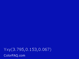 Yxy 3.795,0.153,0.067 Color is a normal blue color and the nearest color is Zaffre #0014a8. Hex code #0711b5 and RGB value is rgb(7,17,181). In RGB color space, this color is composed of 3% red, 7% green, 71% blue, In CMYK color space, this color is composed of 96% cyan, 91% magenta, 0% yellow , 29% black , In HSL color space, this color has a hue angle of 237° , 93% saturation and 37% lightness.