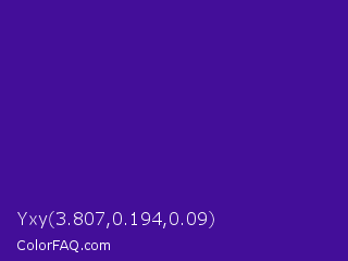Yxy 3.807,0.194,0.09 Color is a normal violet color and the nearest color is Pixie Powder #391285. Hex code #430e99 and RGB value is rgb(67,14,153). In RGB color space, this color is composed of 26% red, 5% green, 60% blue, In CMYK color space, this color is composed of 56% cyan, 91% magenta, 0% yellow , 40% black , In HSL color space, this color has a hue angle of 263° , 83% saturation and 33% lightness.