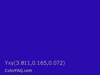 Yxy 3.811,0.165,0.072 Color is a normal indigo color and the nearest color is Interdimensional Blue #360ccc. Hex code #2a0cae and RGB value is rgb(42,12,174). In RGB color space, this color is composed of 16% red, 5% green, 68% blue, In CMYK color space, this color is composed of 76% cyan, 93% magenta, 0% yellow , 32% black , In HSL color space, this color has a hue angle of 251° , 87% saturation and 36% lightness.