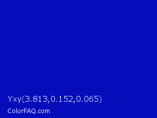 Yxy 3.813,0.152,0.065 Color is a normal blue color and the nearest color is Zaffre #0014a8. Hex code #040db9 and RGB value is rgb(4,13,185). In RGB color space, this color is composed of 2% red, 5% green, 73% blue, In CMYK color space, this color is composed of 98% cyan, 93% magenta, 0% yellow , 27% black , In HSL color space, this color has a hue angle of 237° , 96% saturation and 37% lightness.