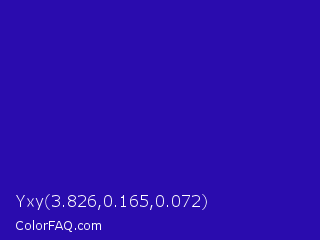 Yxy 3.826,0.165,0.072 Color is a normal indigo color and the nearest color is Interdimensional Blue #360ccc. Hex code #2a0cae and RGB value is rgb(42,12,174). In RGB color space, this color is composed of 16% red, 5% green, 68% blue, In CMYK color space, this color is composed of 76% cyan, 93% magenta, 0% yellow , 32% black , In HSL color space, this color has a hue angle of 251° , 87% saturation and 36% lightness.
