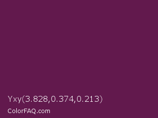 Yxy 3.828,0.374,0.213 Color is a dark magenta color and the nearest color is Tawny Port #692545. Hex code #62194d and RGB value is rgb(98,25,77). In RGB color space, this color is composed of 38% red, 10% green, 30% blue, In CMYK color space, this color is composed of 0% cyan, 74% magenta, 21% yellow , 62% black , In HSL color space, this color has a hue angle of 317° , 59% saturation and 24% lightness.