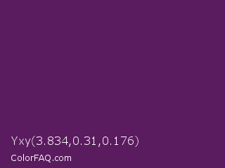 Yxy 3.834,0.31,0.176 Color is a dark magenta color and the nearest color is Palatinate Purple #682860. Hex code #5b1b5f and RGB value is rgb(91,27,95). In RGB color space, this color is composed of 36% red, 11% green, 37% blue, In CMYK color space, this color is composed of 4% cyan, 72% magenta, 0% yellow , 63% black , In HSL color space, this color has a hue angle of 296° , 56% saturation and 24% lightness.