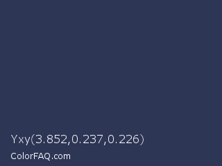 Yxy 3.852,0.237,0.226 Color is a dark blue color and the nearest color is Martinique #363050. Hex code #2d3655 and RGB value is rgb(45,54,85). In RGB color space, this color is composed of 18% red, 21% green, 33% blue, In CMYK color space, this color is composed of 47% cyan, 36% magenta, 0% yellow , 67% black , In HSL color space, this color has a hue angle of 227° , 31% saturation and 25% lightness.