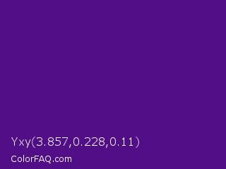 Yxy 3.857,0.228,0.11 Color is a dark purple color and the nearest color is Pigment Indigo #4b0082. Hex code #520e87 and RGB value is rgb(82,14,135). In RGB color space, this color is composed of 32% red, 5% green, 53% blue, In CMYK color space, this color is composed of 39% cyan, 90% magenta, 0% yellow , 47% black , In HSL color space, this color has a hue angle of 274° , 81% saturation and 29% lightness.