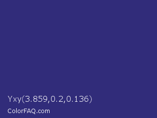 Yxy 3.859,0.2,0.136 Color is a normal indigo color and the nearest color is St Patricks Blue #23297a. Hex code #312c7a and RGB value is rgb(49,44,122). In RGB color space, this color is composed of 19% red, 17% green, 48% blue, In CMYK color space, this color is composed of 60% cyan, 64% magenta, 0% yellow , 52% black , In HSL color space, this color has a hue angle of 244° , 47% saturation and 33% lightness.