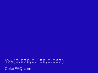 Yxy 3.878,0.158,0.067 Color is a normal indigo color and the nearest color is Interdimensional Blue #360ccc. Hex code #1e09b7 and RGB value is rgb(30,9,183). In RGB color space, this color is composed of 12% red, 4% green, 72% blue, In CMYK color space, this color is composed of 84% cyan, 95% magenta, 0% yellow , 28% black , In HSL color space, this color has a hue angle of 247° , 91% saturation and 38% lightness.