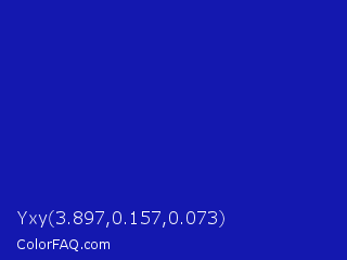 Yxy 3.897,0.157,0.073 Color is a normal blue color and the nearest color is Blue Pantone #0018a8. Hex code #1418af and RGB value is rgb(20,24,175). In RGB color space, this color is composed of 8% red, 9% green, 69% blue, In CMYK color space, this color is composed of 89% cyan, 86% magenta, 0% yellow , 31% black , In HSL color space, this color has a hue angle of 238° , 79% saturation and 38% lightness.