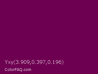 Yxy 3.909,0.397,0.196 Color is a very dark magenta color and the nearest color is Pompadour #660045. Hex code #6e0051 and RGB value is rgb(110,0,81). In RGB color space, this color is composed of 43% red, 0% green, 32% blue, In CMYK color space, this color is composed of 0% cyan, 100% magenta, 26% yellow , 57% black , In HSL color space, this color has a hue angle of 316° , 100% saturation and 22% lightness.