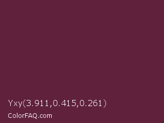 Yxy 3.911,0.415,0.261 Color is a dark rose color and the nearest color is Wine Berry #591d35. Hex code #60213d and RGB value is rgb(96,33,61). In RGB color space, this color is composed of 38% red, 13% green, 24% blue, In CMYK color space, this color is composed of 0% cyan, 66% magenta, 36% yellow , 62% black , In HSL color space, this color has a hue angle of 333° , 49% saturation and 25% lightness.
