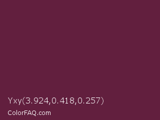 Yxy 3.924,0.418,0.257 Color is a dark rose color and the nearest color is Tawny Port #692545. Hex code #621f3e and RGB value is rgb(98,31,62). In RGB color space, this color is composed of 38% red, 12% green, 24% blue, In CMYK color space, this color is composed of 0% cyan, 68% magenta, 37% yellow , 62% black , In HSL color space, this color has a hue angle of 332° , 52% saturation and 25% lightness.