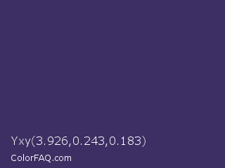 Yxy 3.926,0.243,0.183 Color is a dark indigo color and the nearest color is Jacarta #3a2a6a. Hex code #3d2f63 and RGB value is rgb(61,47,99). In RGB color space, this color is composed of 24% red, 18% green, 39% blue, In CMYK color space, this color is composed of 38% cyan, 53% magenta, 0% yellow , 61% black , In HSL color space, this color has a hue angle of 256° , 36% saturation and 29% lightness.