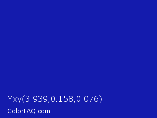 Yxy 3.939,0.158,0.076 Color is a normal blue color and the nearest color is Blue Pantone #0018a8. Hex code #141bad and RGB value is rgb(20,27,173). In RGB color space, this color is composed of 8% red, 11% green, 68% blue, In CMYK color space, this color is composed of 88% cyan, 84% magenta, 0% yellow , 32% black , In HSL color space, this color has a hue angle of 237° , 79% saturation and 38% lightness.