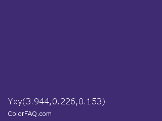 Yxy 3.944,0.226,0.153 Color is a normal indigo color and the nearest color is Jacarta #3a2a6a. Hex code #3e2b71 and RGB value is rgb(62,43,113). In RGB color space, this color is composed of 24% red, 17% green, 44% blue, In CMYK color space, this color is composed of 45% cyan, 62% magenta, 0% yellow , 56% black , In HSL color space, this color has a hue angle of 256° , 45% saturation and 31% lightness.