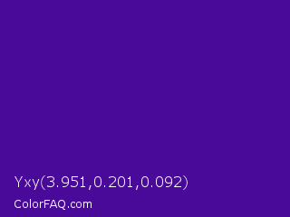 Yxy 3.951,0.201,0.092 Color is a normal violet color and the nearest color is Pigment Indigo #4b0082. Hex code #4a0a99 and RGB value is rgb(74,10,153). In RGB color space, this color is composed of 29% red, 4% green, 60% blue, In CMYK color space, this color is composed of 52% cyan, 93% magenta, 0% yellow , 40% black , In HSL color space, this color has a hue angle of 267° , 88% saturation and 32% lightness.