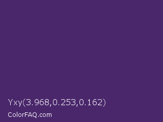 Yxy 3.968,0.253,0.162 Color is a dark purple color and the nearest color is Honey Flower #4f1c70. Hex code #4a276b and RGB value is rgb(74,39,107). In RGB color space, this color is composed of 29% red, 15% green, 42% blue, In CMYK color space, this color is composed of 31% cyan, 64% magenta, 0% yellow , 58% black , In HSL color space, this color has a hue angle of 271° , 47% saturation and 29% lightness.