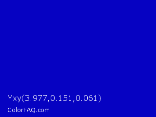 Yxy 3.977,0.151,0.061 Color is a normal indigo color and the nearest color is Dark Blue #0000c8. Hex code #0602c2 and RGB value is rgb(6,2,194). In RGB color space, this color is composed of 2% red, 1% green, 76% blue, In CMYK color space, this color is composed of 97% cyan, 99% magenta, 0% yellow , 24% black , In HSL color space, this color has a hue angle of 241° , 98% saturation and 38% lightness.