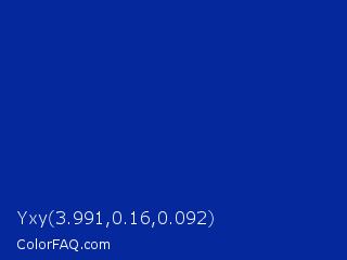 Yxy 3.991,0.16,0.092 Color is a normal blue color and the nearest color is Torea Bay #0f2d9e. Hex code #06289d and RGB value is rgb(6,40,157). In RGB color space, this color is composed of 2% red, 16% green, 62% blue, In CMYK color space, this color is composed of 96% cyan, 75% magenta, 0% yellow , 38% black , In HSL color space, this color has a hue angle of 226° , 93% saturation and 32% lightness.