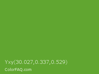 Yxy 30.027,0.337,0.529 Color is a normal green color and the nearest color is Green RYB #66b032. Hex code #61a630 and RGB value is rgb(97,166,48). In RGB color space, this color is composed of 38% red, 65% green, 19% blue, In CMYK color space, this color is composed of 42% cyan, 0% magenta, 71% yellow , 35% black , In HSL color space, this color has a hue angle of 95° , 55% saturation and 42% lightness.